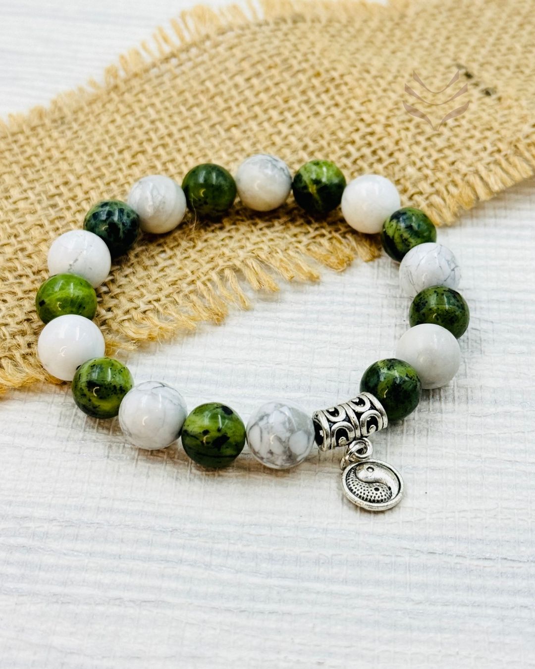 The Karmic Debt Release bracelet, featuring chrysoprase and howlite, is like a gentle guide on your journey to releasing past burdens and finding inner peace. Chrysoprase, with its soothing green hues, aids in letting go of negative emotions and past traumas, while howlite promotes calmness and clarity of mind.
