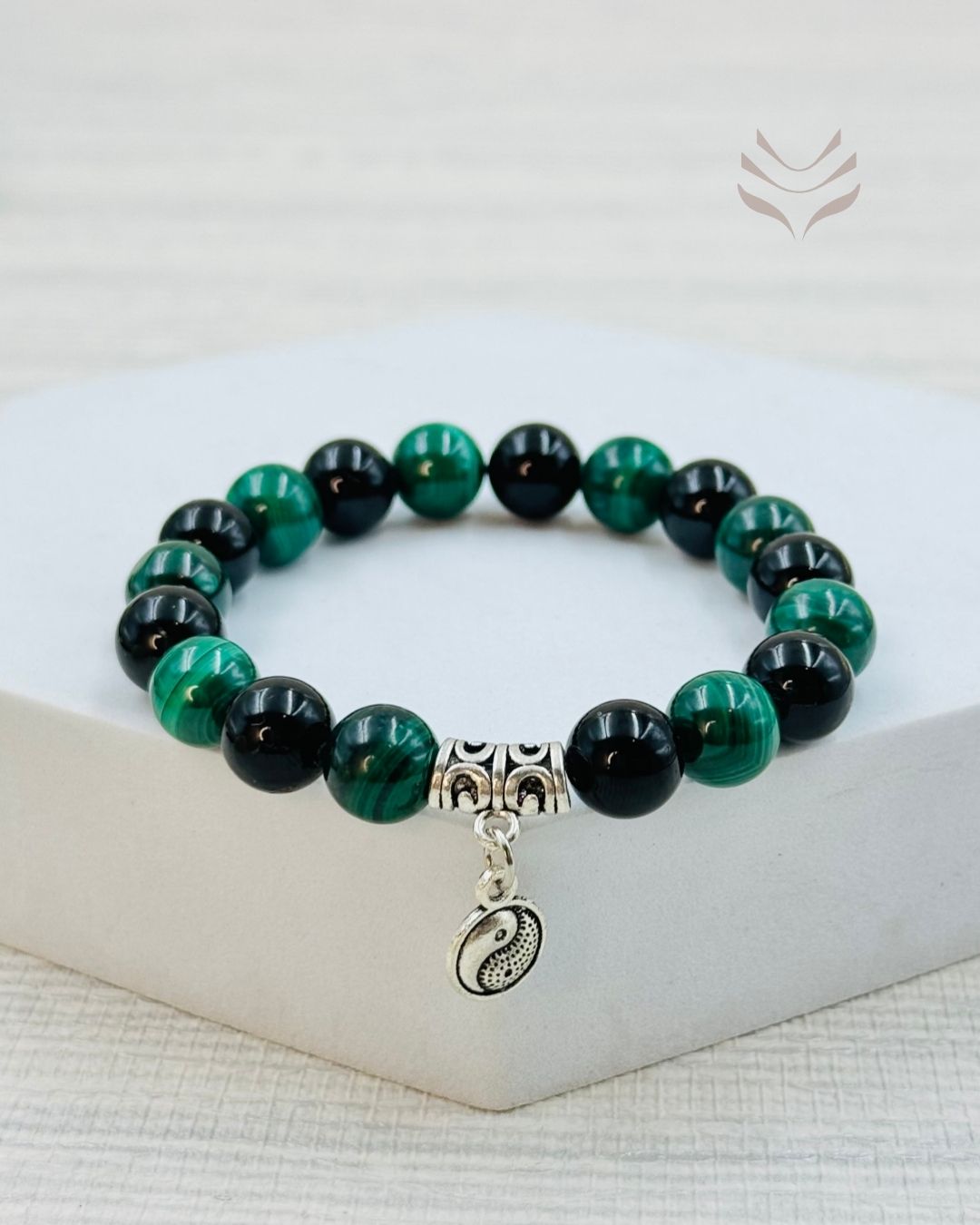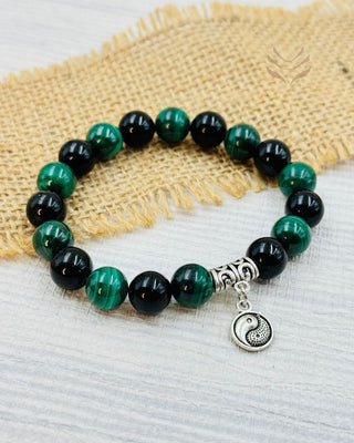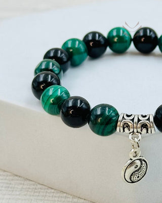 The Karmic Pattern Release bracelet made of obsidian and malachite helps you let go of old habits and negative emotions from your past lives or experiences. Obsidian absorbs negative energy and helps you think deeply about your feelings. Malachite, with its green color, supports you in changing and growing as a person. Together, these stones help you face your past and move forward with positivity and courage.